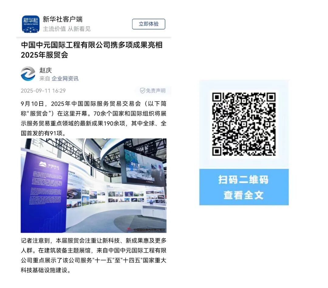 9月10日-14日,中国国际服务贸易交易会(简称"服贸会")在北京首钢园区举办。中国中元作为设计咨询行业的骨干企业,精彩亮相工程咨询与建筑服务专题展区。中央广播电视总台、新华社及网易、搜狐等平台分别进行采访报道。